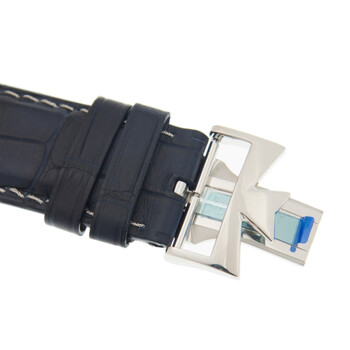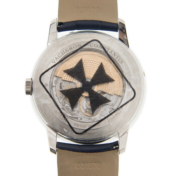 Silver-tone platinum case with a blue alligator leather strap. Fixed silver-tone platinum bezel. Silver-tone dial with silver-tone hands and index hour markers. Minute markers around the outer rim. Dial Type: Analog. Date retrograde. Two sub-dials displaying: retrograde date and retrograde day. Vacheron Constantin Calibre 2460 R31R7/2 Automatic movement, containing 27 Jewels, composed of 276 parts, bitting at 28800 vph, and has a power reserve of approximately 40 hours. Scratch resistant sapphire crystal. Screw down crown. Transparent case back. Round case shape, case size: 42.5 mm. Deployment clasp. Water resistant at 30 meters / 100 feet. Functions: retrograde, date, day, hour, minute. Additional Info: original box, international warranty card, manual (complete accessories). Patrimony Traditionelle Series. Luxury watch style. Watch label: Swiss Made. Vacheron Constantin Patrimony Traditionelle Automatic Silver Dial Watch 86020000P9345.