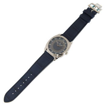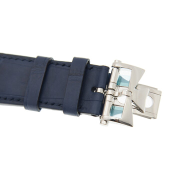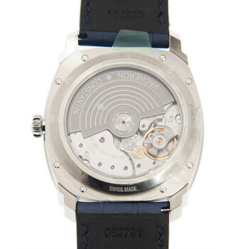 Silver-tone stainless steel case with a blue leather strap. Fixed silver-tone stainless steel bezel. Blue dial with silver-tone hands and index-Arabic numerals hour markers. Minute markers around the outer rim. Dial Type: Analog. Luminescent hands. Days of the month around inner rim. Vacheron Constantin Calibre 5100/1 Automatic movement, based upon Vacheron Constantin 5100, containing 37 Jewels, bitting at 28800 vph, and has a power reserve of approximately 60 hours. Scratch resistant sapphire crystal. Transparent case back. Round case shape, case size: 41 mm x 50.26 mm, case thickness: 11.75 mm. Deployant buckle clasp. Water resistant at 30 meters / 100 feet. Functions: date, hour, minute, second. Quai De L Ile Series. Luxury watch style. Watch label: Swiss Made. Vacheron Constantin Quai de l Ile Automatic Blue Dial Men's Watch 4500S/000A-B364.