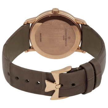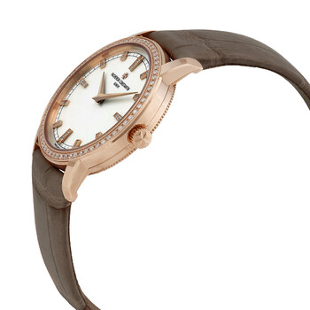 18kt rose gold case with a beige (alligator) leather strap. Fixed 18kt rose gold bezel set with 64 Wesselton diamonds. Silver dial with rose gold hands and diamond-set index hour markers. Minute markers around the outer rim. Dial Type: Analog. Vacheron Constantin calibre 1202 quartz movement. Scratch resistant sapphire crystal. Pull / push crown. Solid case back. Round case shape. Case size: 30 mm. Case thickness: 6.73 mm. Band width: 17.8 mm. Band length: 7 inches. Tang clasp. Water resistant at 30 meters / 100 feet. Functions: hour, minute. Traditionelle Series. Luxury watch style. Watch label: Swiss Made. Item Variations: 25558000R-9406 , 25558/000R-9406 , X25R1775. Vacheron Constantin Traditionnelle 18kt Rose Gold Silver Dial Diamond Beige Leather Ladies Watch 25558000R-9406.