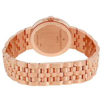 18kt pink gold case with a 18kt pink gold bracelet. Fixed 18kt pink gold bezel with diamond set. Diamond pave dial with rose gold dauphine-style shape hands and diamond hour markers. Dial Type: Analog. Vacheron Constantin Calibre 1202 quartz movement. Scratch resistant sapphire crystal. Solid case back. Round case shape, case size: 30 mm, case thickness: 5.98 mm. Deployment clasp. Water resistant at 30 meters / 100 feet. Functions: hour, minute. Traditionnelle Series. Dress watch style. Watch label: Swiss Made. Item Variations: 25553Q01R-9696 , 25553/Q01R-9696 , X25R5409. Vacheron Constantin Traditionnelle Diamond Pave Dial Ladies Watch 25553/Q01R-9696.