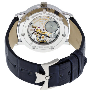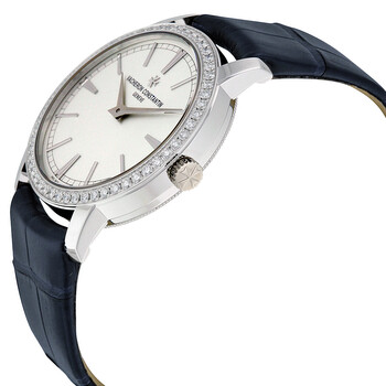 18kt white gold case with a dark blue leather strap. Fixed 18kt white gold bezel with diamond set. Silver dial with white dauphine-style shape hands and index hour markers. Minute markers around the outer rim. Dial Type: Analog. Vacheron Constantin Calibre 1400 Hand Wind movement, containing 20 Jewels, composed of 98 parts, bitting at 28800 vph, and has a power reserve of approximately 40 hours. Scratch resistant sapphire crystal. Pull / push crown. Transparent case back. Round case shape, case size: 33 mm, case thickness: 7.7 mm. Tang clasp. Water resistant at 30 meters / 100 feet. Functions: hour, minute. Traditionnelle Series. Luxury watch style. Watch label: Swiss Made. Item Variations: 81590000G-9848 , 81590/000G-9848 , X81G6355. Vacheron Constantin Traditionnelle Ladies Watch 81590/000G-9848.