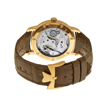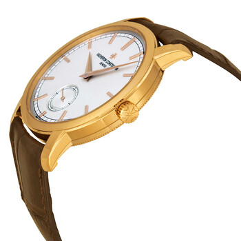 18kt rose gold case with a brown alligator leather strap. Fixed 18kt rose gold bezel. Silver dial with rose gold dauphine-style shape hands and index hour markers. Minute markers around the outer rim. Dial Type: Analog. One subdial displaying: small second at the 6 o'clock position. Vacheron Constantin Calibre 4400 AS Hand Wind movement, containing 21 Jewels, composed of 127 parts, bitting at 28800 vph, and has a power reserve of approximately 65 hours. Scratch resistant sapphire crystal. Pull / push crown. Skeleton case back. Round case shape, case size: 38 mm, case thickness: 7.87 mm. Band width: 20.3 mm, band length: 8 inches. Tang clasp. Water resistant at 30 meters / 100 feet. Functions: hour, minute, second. Traditionnelle Series. Luxury watch style. Watch label: Swiss Made. Item Variations: 82172000R-9382 , 82172/000R-9382 , X82R1777. Vacheron Constantin Traditionnelle Manual Wind Silver Dial Brown Leather Men's Watch 82172000R-9382.