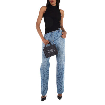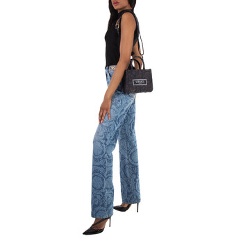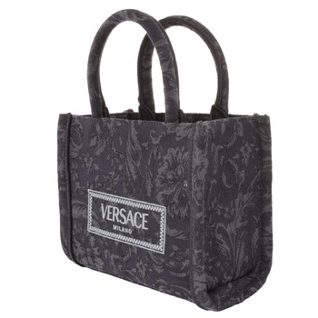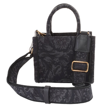 Versace Ladies Tote. SKU: 1015288-1A09741-BLACK+BLACK-VERSACE. Barcode: 8053609379451. Color: Black/Black/Versace/Gold. Size: W 19.5 x H 17 x D 10.5 cm. Versace Barocco Athena Tote Bag. This jacquard Barocco canvas tote bag features rigid top handles, a detachable crossbody strap for versatile carrying options, and is finished with '90s Vintage Logo Versace embroidery. 53% polyamide, 38% cotton, 6% polyester, 3% acrylic. Made in Italy.