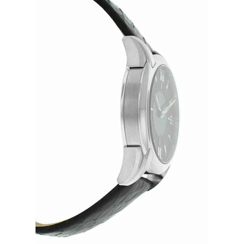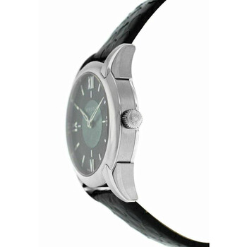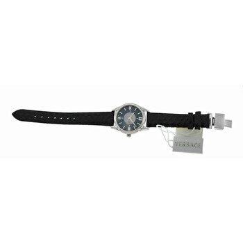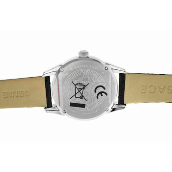 Silver-tone stainless steel case with a black calfskin leather strap. Fixed silver-tone stainless steel bezel. Black dial with silver-tone hands and Arabic numeral and index hour markers. Dial Type: Analog. Swiss quartz movement. Scratch resistant antireflective sapphire crystal. Pull / push crown. Case size: 33 mm. Case thickness: 7.5 mm. Round case shape. Band width: 15 mm. Band length: 7.5 inches. Deployant buckle clasp. Water resistant at 50 meters / 165 feet. Functions: hour, minute. Dress watch style. Watch label: Swiss Made. Versace Black Dial Dafne Ladies Watch VFF010013.