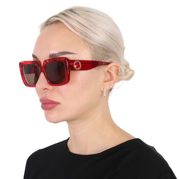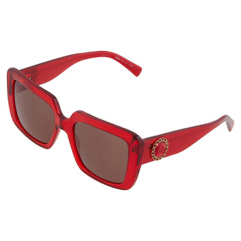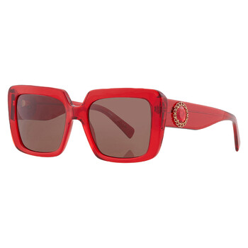 Versace Sunglasses. Series number: VE4384B. Color code: 528073. Shape: Shield. Lens Width: 54 mm. Lens Bridge: 19 mm. Arm Length: 140 mm. 100% UV protection. Non-Polarized. Frame Material: Plastic. Frame Color: Transparent Red. Lenses Type: Brown. Rim Style: Full-Rim. UPC/EAN code: 8056597160728. Versace Brown Shield Ladies Sunglasses VE4384B 528073 54.