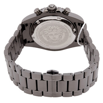 Gunmetal IP stainless steel case and bracelet. Fixed tachymeter scale gunmetal IP stainless steel bezel. Green dial with black hands and index hour markers. Minute markers around the outer rim. Dial Type: Analog. Date display at the 4 o'clock position. Chronograph - three sub-dials displaying: 60 second, 30 minute and 1/10th of a second. Quartz movement. Scratch resistant sapphire crystal. Pull / push crown. Solid case back. Round case shape, case size: 44 mm. Fold over clasp with a safety release. Water resistant at 50 meters / 165 feet. Functions: chronograph, date, hour, minute, second. Chrono Series. Sport watch style. Watch label: Swiss Made. Versace Chrono Chronograph Quartz Green Dial Men's Watch VE9K01224.