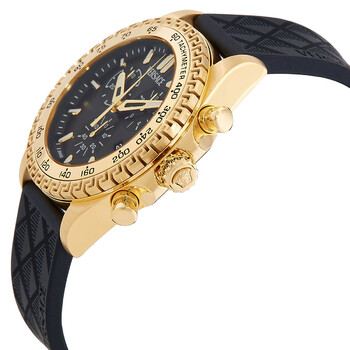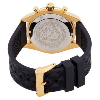 Gold-tone stainless steel case with a black silicone strap. Fixed tachymeter scale gold-tone stainless steel bezel. Black dial with gold-tone hands and index hour markers. Minute markers around the outer rim. Dial Type: Analog. Date display at the 4 o'clock position. Chronograph - three sub-dials displaying: 60 second, 30 minute and 1/10th of a second. Quartz movement. Scratch resistant sapphire crystal. Pull / push crown. Solid case back. Round case shape, case size: 44 mm. Buckle clasp. Water resistant at 50 meters / 165 feet. Functions: chronograph, date, hour, minute, second. Sport watch style. Watch label: Swiss Made. Versace Chronograph Quartz Black Dial Men's Watch VE9K00824.