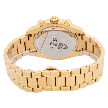 Gold-tone stainless steel case and bracelet. Fixed tachymeter scale gold-tone stainless steel bezel. Black dial with gold-tone hands and index hour markers. Minute markers around the outer rim. Dial Type: Analog. Date display at the 4 o'clock position. Chronograph - three sub-dials displaying: 60 second, 30 minute and 1/10th of a second. Quartz movement. Scratch resistant sapphire crystal. Pull / push crown. Solid case back. Round case shape, case size: 44 mm. Fold over clasp with a safety release. Water resistant at 50 meters / 165 feet. Functions: chronograph, date, hour, minute, second. Chrono Series. Sport watch style. Watch label: Swiss Made. Versace Chronograph Quartz Black Dial Men's Watch VE9K01124.