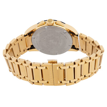 Gold-tone stainless steel case and bracelet. Fixed black stainless steel bezel. Black dial with gold-tone hands and index hour markers. Minute markers around the outer rim. Dial Type: Analog. Date display at the 3 o'clock position. Quartz movement. Scratch resistant sapphire crystal. Pull / push crown. Solid case back. Round case shape, case size: 42 mm, case thickness: 11 mm. Band width: 17 mm. Deployment with push button release clasp. Water resistant at 50 meters / 165 feet. Functions: chronograph, date, hour, minute, second. Dress watch style. Watch label: Swiss Made. Versace Chronograph Quartz Black Dial Men's Watch VEM800524.