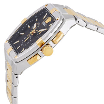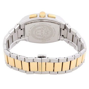 Silver-tone stainless steel case with a two-tone (silver-tone and gold-tone) stainless steel bracelet. Fixed silver-tone stainless steel bezel. Black dial with gold-tone hands and index hour markers. Minute markers around the outer rim. Dial Type: Analog. Luminescent hands and markers. Date display at the 4 o'clock position. Quartz movement. Scratch resistant sapphire crystal. Pull / push crown. Solid case back. Tonneau case shape, case size: 44 x 54.3. Deployment with push button release clasp. Water resistant at 50 meters / 165 feet. Functions: chronograph, date, hour, minute, second. Dress watch style. Watch label: Swiss Made. Versace Chronograph Quartz Black Dial Men's Watch VESP00524.