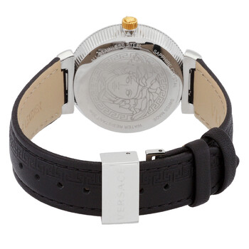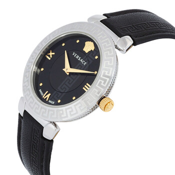 Silver-tone stainless steel case with a black leather strap. Fixed silver-tone stainless steel bezel. Black dial with gold-tone hands and index-Roman numeral hour markers. Dial Type: Analog. Quartz movement. Scratch resistant sapphire crystal. Pull / push crown. Solid case back. Round case shape, case size: 35 mm, case thickness: 8 mm. Band width: 19 mm. Buckle clasp. Water resistant at 30 meters / 100 feet. Functions: hour, minute. Daphnis Series. Casual watch style. Watch label: Swiss Made. Versace Daphnis Quartz Black Dial Ladies Watch V16020017.