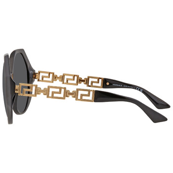 Versace Sunglasses. Series number: VE4395. Color code: 534587. Shape: Geometric. Lens Width: 59 mm. Lens Bridge: 17 mm. Arm Length: 145 mm. 100% UV protection. Non-Polarized. Frame Material: Metal;Plastic. Frame Color: Black. Lenses Type: Dark Gray. Rim Style: Full-Rim. UPC/EAN code: 8056597352734. Versace Dark Gray Geometric Ladies Sunglasses VE4395 534587 59.