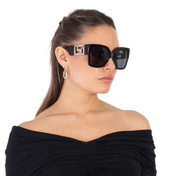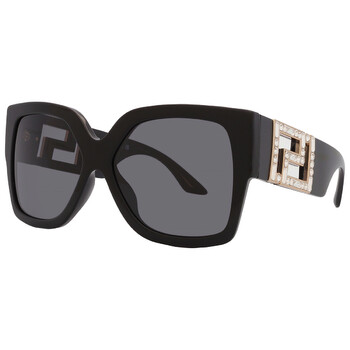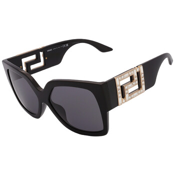 Versace Sunglasses. Series number: VE4402. Color code: 547887. Shape: Butterfly. Lens Width: 59 mm. Lens Bridge: 16 mm. Arm Length: 140 mm. 100% UV protection. Non-Polarized. Frame Material: Acetate. Frame Color: Black. Lenses Type: Dark Grey. Rim Style: Full-Rim. UPC/EAN code: 8056262048801. Versace Dark Grey Butterfly Ladies Sunglasses VE4402 547887 59.