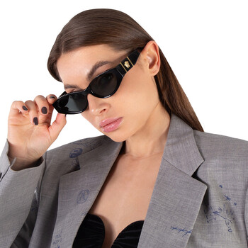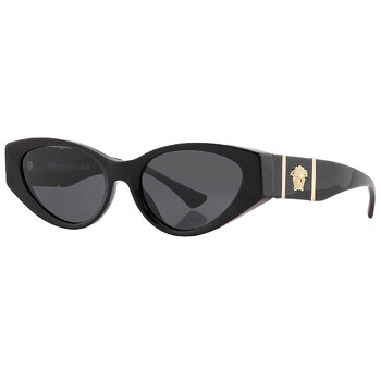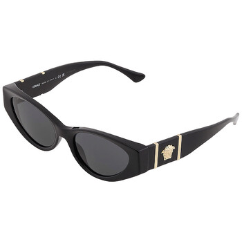 Versace Sunglasses. Series number: VE4454. Color code: GB1/87. Shape: Cat Eye. Lens Width: 55 mm. Lens Bridge: 18 mm. Arm Length: 140 mm. 100% UV protection. Non-Polarized. Frame Material: Acetate. Frame Color: Black. Lenses Type: Dark Grey. Rim Style: Full-Rim. UPC/EAN code: 8056597921947. Versace Dark Grey Cat Eye Ladies Sunglasses VE4454 GB1/87 55.