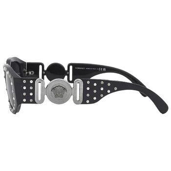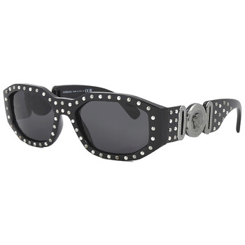 Versace Sunglasses. Series number: VE4361. Color code: 539887. Shape: Geometric. Lens Width: 53 mm. Lens Bridge: 18 mm. Arm Length: 140 mm. 100% UV protection. Frame Material: Plastic. Frame Color: Black. Lenses Type: Dark Grey. Rim Style: Full-Rim. UPC/EAN code: 8056597809795. Versace Dark Grey Geometric Men's Sunglasses VE4361 539887 53.