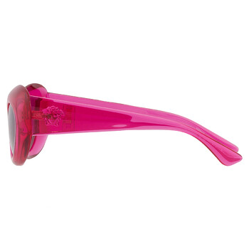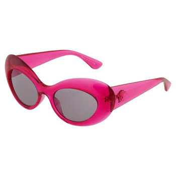 Versace Sunglasses. Series number: VE4456U. Color code: 533487. Shape: Oval. Lens Width: 52 mm. Lens Bridge: 19 mm. Arm Length: 140 mm. 100% UV protection. Non-Polarized. Frame Material: Plastic. Frame Color: Transparent Pink. Lenses Type: Dark Grey. Rim Style: Full-Rim. UPC/EAN code: 8056597921114. Versace Dark Grey Oval Ladies Sunglasses VE4456U 533487 52.