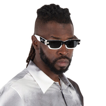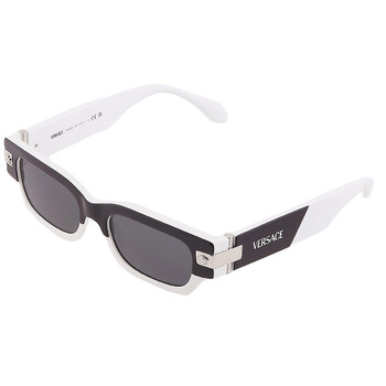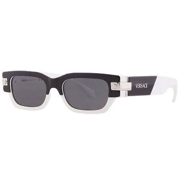 Versace Sunglasses. Series number: VE4465. Color code: 545987. Shape: Rectangular. Lens Width: 53 mm. Lens Bridge: 18 mm. Arm Length: 145 mm. 100% UV protection. Non-Polarized. Frame Material: Acetate. Frame Color: Top Black/White. Lenses Type: Dark Grey. Rim Style: Full-Rim. UPC/EAN code: 8056262013984. Versace Dark Grey Rectangular Men's Sunglasses VE4465 545987 53.