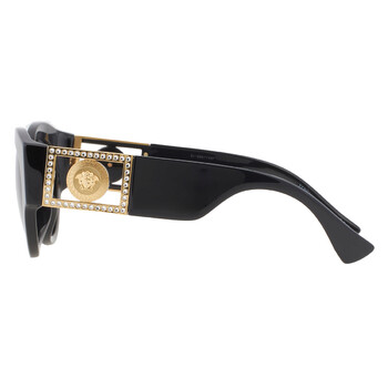Versace Sunglasses. Series number: VE4438BF. Color code: GB1/87. Shape: Round. Lens Width: 52 mm. Lens Bridge: 22 mm. Arm Length: 145 mm. 100% UV protection. Frame Material: Plastic;Metal. Frame Color: Black;Gold. Lenses Type: Dark Grey. Rim Style: Full-Rim. UPC/EAN code: 8056597734554. Versace Dark Grey Round Ladies Sunglasses VE4438BF GB1/87 52.
