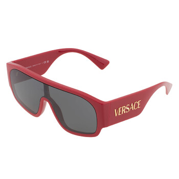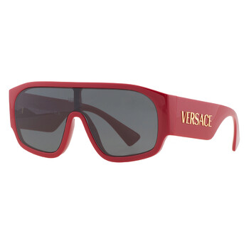 Versace Sunglasses. Series number: VE4439. Color code: 538887. Shape: Shield. Lens Width: 33 mm. Lens Bridge: 133 mm. Arm Length: 145 mm. 100% UV protection. Non-Polarized. Frame Material: Plastic. Frame Color: Red. Lenses Type: Dark Grey. Rim Style: Full-Rim. UPC/EAN code: 8056597785303. Versace Dark Grey Shield Ladies Sunglasses VE4439 538887 33.