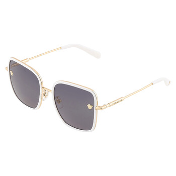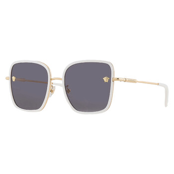 Versace Sunglasses. Series number: VE2247D. Color code: 147187. Shape: Square. Lens Width: 57 mm. Lens Bridge: 19 mm. Arm Length: 145 mm. 100% UV protection. Non-Polarized. Frame Material: Metal. Frame Color: White/Gold. Lenses Type: Dark Grey. Rim Style: Full-Rim. UPC/EAN code: 8056597650403. Versace Dark Grey Square Ladies Sunglasses VE2247D 147187 57.