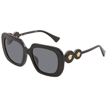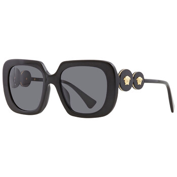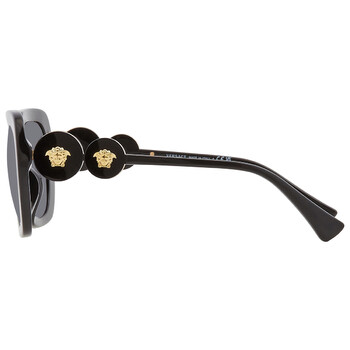 Versace Sunglasses. Series number: VE4334F. Color code: GB1/87. Shape: Square. Lens Width: 54 mm. Lens Bridge: 20 mm. Arm Length: 145 mm. 100% UV protection. Frame Material: Plastic. Frame Color: Black. Lenses Type: Dark Grey. Rim Style: Full-Rim. UPC/EAN code: 8056597735315. Versace Dark Grey Square Ladies Sunglasses VE4334F GB1/87 54.
