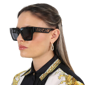 Versace Sunglasses. Series number: VE4431F. Color code: 538087. Shape: Square. Lens Width: 50 mm. Lens Bridge: 22 mm. Arm Length: 145 mm. 100% UV protection. Non-Polarized. Frame Material: Plastic. Frame Color: Black. Lenses Type: Dark Grey. Rim Style: Full-Rim. UPC/EAN code: 8056597735261. Versace Dark Grey Square Ladies Sunglasses VE4431F 538087 50.