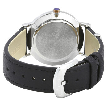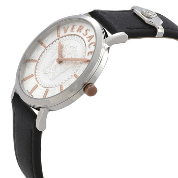 Silver-tone stainless steel case with a black leather strap. Fixed silver-tone stainless steel bezel. White dial with rose gold-tone hands and index hour markers. Dial Type: Analog. Quartz movement. Scratch resistant sapphire crystal. Pull / push crown. Solid case back. Round case shape, case size: 36 mm, case thickness: 7.3 mm. Band width: 18 mm. Tang clasp. Water resistant at 50 meters / 165 feet. Functions: hour, minute. Essential Series. Casual watch style. Watch label: Swiss Made. Versace Essential Quartz White Dial Ladies Watch VEK400721.