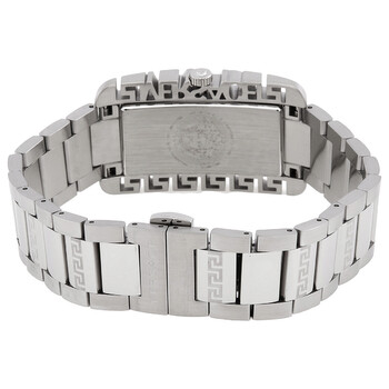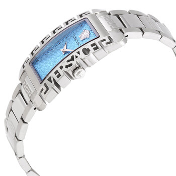 Silver-tone stainless steel case and bracelet. Fixed silver-tone stainless steel bezel. Blue dial with silver-tone hands. Medusa head marks the 12 o'clock position. Minute markers around the outer rim. Dial Type: Analog. Quartz movement. Scratch resistant sapphire crystal. Pull / push crown. Solid case back. Rectangle case shape, case size: 27 x 45 mm, case thickness: 8 mm. Band width: 18 mm. Deployment with push button release clasp. Water resistant at 30 meters / 100 feet. Functions: hour, minute. Flair Gent Series. Casual watch style. Watch label: Swiss Made. Versace Flair Gent Quartz Blue Dial Unisex Watch VE7D00223.