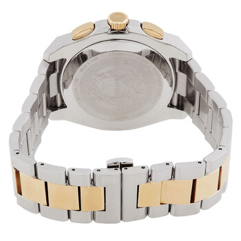 Two-tone (silver-tone and gold-tone) stainless steel case and bracelet. Fixed gold-tone bezel. Silver dial with gold-tone hands and index hour markers. Dial Type: Analog. Luminescent hands. Date display at the 4 o'clock position. Chronograph - three sub-dials displaying: 60 second, 30 minute and 1/10th of a second. Quartz movement. Scratch resistant sapphire crystal. Cushion case shape, case size: 43 mm. Buckle clasp. Water resistant at 50 meters / 165 feet. Functions: chronograph, date, hour, minute, second. Geo Series. Dress watch style. Watch label: Swiss Made. Versace Geo Chronograph Quartz Silver Dial Men's Watch VE7CA0823.