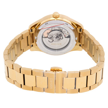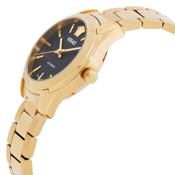 Gold-tone stainless steel case and bracelet. Fixed gold-tone stainless steel bezel. Black dial with gold-tone hands and index hour markers. Dial Type: Analog. Date display at the 3 o'clock position. Automatic movement. Scratch resistant sapphire crystal. Pull / push crown. Solid case back. Round case shape, case size: 35 mm, case thickness: 10 mm. Band width: 16 mm. Deployment with push button release clasp. Water resistant at 50 meters / 165 feet. Functions: date, hour, minute, second. Greca Classic Series. Casual watch style. Watch label: Swiss Made. Versace Greca Classic Automatic Black Dial Ladies Watch VESCA0624.