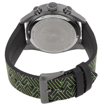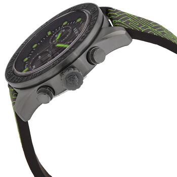 Black stainless steel case with a green leather strap. Fixed black stainless steel bezel. Black dial with black hands and batons hour markers. Minute scale around the inner rim. Dial Type: Analog. Luminescent hands and markers. Date display at the 4 o'clock position. Chronograph - three sub-dials displaying: 60 second, 60 minute and 1/10th of a second. Quartz movement. Scratch resistant sapphire crystal. Pull / push crown. Solid case back. Round case shape, case size: 43 mm, case thickness: 13 mm. Buckle clasp. Water resistant at 50 meters / 165 feet. Functions: chronograph, date, hour, minute, second. Greca Dome Series. Dress watch style. Watch label: Swiss Made. Versace Greca Dome Chronograph Quartz Black Dial Men's Watch VE6K00223.