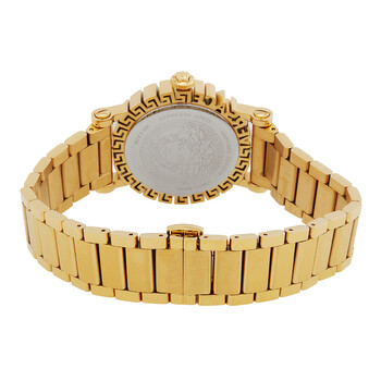 Gold PVD stainless steel case and bracelet. Fixed gold PVD stainless steel bezel. Black dial with gold-tone hands and index hour markers. Dial Type: Analog. Luminescent hands and markers. Quartz movement. Scratch resistant sapphire crystal. Pull / push crown. Solid case back. Round case shape, case size: 40 mm. Fold over clasp with a safety release. Water resistant at 50 meters / 165 feet. Functions: hour, minute, second. Greca Glam Series. Dress watch style. Watch label: Swiss Made. Versace Greca Glam Quartz Black Dial Men's Watch VE6D00323.