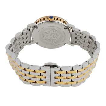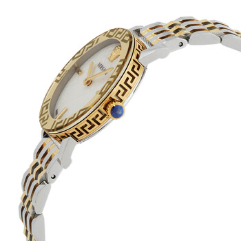 Gold-tone stainless steel case with a two-tone (silver-tone and gold-tone) stainless steel bracelet. Fixed (greca pattern) gold-tone stainless steel bezel. White mother of pearl dial with gold-tone hands and index hour markers. Medusa-head embellishment at 12 o’clock position. Dial Type: Analog. Quartz movement. Scratch resistant sapphire crystal. Pull / push crown. Solid case back. Round case shape, case size: 32 mm. Band width: 16 mm. Deployant clasp. Water resistant at 30 meters / 100 feet. Functions: hour, minute. Greca Glass Series. Casual watch style. Watch label: Swiss Made. Versace Greca Glass Quartz White Mother of Pearl Dial Ladies Watch VEU300421.