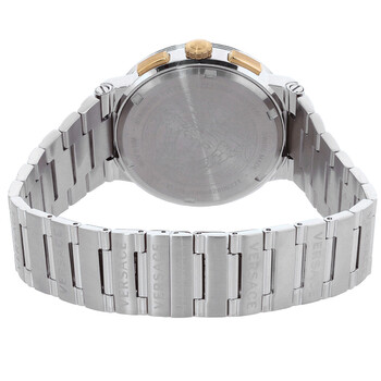 Silver-tone stainless steel case and bracelet. Fixed silver-tone stainless steel bezel. Blue dial with gold-tone hands and index hour markers. Medusa head marks the 12 o'clock position. Minute markers around the outer rim. Dial Type: Analog. Luminescent hands and markers. Date display at the 4 o'clock position. Three sub-dials displaying: 60 second, 30 minute and day of the week. Quartz movement. Scratch resistant sapphire crystal. Pull / push crown. Solid case back. Round case shape, case size: 43 mm, case thickness: 10.5 mm. Deployment with push button release clasp. Water resistant at 50 meters / 165 feet. Functions: chronograph, date, day, hour, minute, second. Greca Logo Series. Sport watch style. Watch label: Swiss Made. Versace Greca Logo Chronograph Quartz Blue Dial Men's Watch VEZ900221.