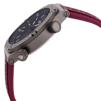 Silver-tone stainless steel case with a claret red silicone strap. Fixed silver-tone stainless steel bezel. Black dial with black hands and index hour markers. Minute markers around the outer rim. Dial Type: Analog. Luminescent hands and markers. Date display at the 3 o'clock position. Quartz movement. Scratch resistant sapphire crystal. Pull / push crown. Solid case back. Round case shape, case size: 43 mm. Tang clasp. Water resistant at 100 meters / 330 feet. Functions: date, hour, minute, second. Greca Logo Diver Series. Dress watch style. Watch label: Swiss Made. Versace Greca Logo Diver Quartz Black Dial Men's Watch VE8G00224.