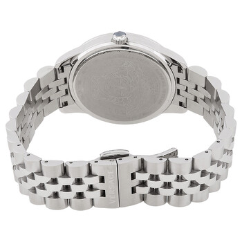 Silver-tone stainless steel case and bracelet. Fixed (greca pattern) silver-tone stainless steel bezel. Black dial with gold-tone hands. Roman numerals mark the 3, 6, and 9 o'clock positions. Dial Type: Analog. Quartz movement. Scratch resistant sapphire crystal. Pull / push crown. Solid case back. Round case shape, case size: 38 mm. Band width: 16 mm. Fold over clasp. Water resistant at 50 meters / 165 feet. Functions: hour, minute. Greca Signature Series. Dress watch style. Watch label: Swiss Made. Versace Greca Signature Quartz Black Dial Ladies Watch VEVC00419.