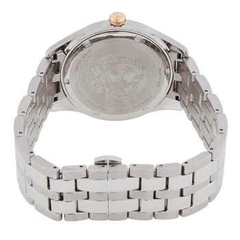 Silver-tone stainless steel case and bracelet. Fixed silver-tone stainless steel bezel. Black dial with gold-tone hands and index hour markers. Medusa head marks the 12 o'clock position. Minute markers around the outer rim. Dial Type: Analog. Luminescent hands and markers. Date display at the 3 o'clock position. Quartz movement. Scratch resistant sapphire crystal. Pull / push crown. Solid case back. Round case shape, case size: 41 mm. Deployment with push button release clasp. Water resistant at 50 meters / 165 feet. Functions: date, hour, minute, second. Greca Time Series. Casual watch style. Watch label: Swiss Made. Versace Greca Time Quartz Black Dial Men's Watch VE3K00322.