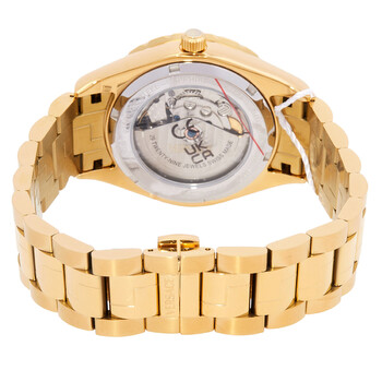Gold-tone stainless steel case and bracelet. Fixed black stainless steel bezel. Black dial with gold-tone hands and index hour markers. Minute markers around the outer rim. Dial Type: Analog. Luminescent hands and markers. Date display at the 3 o'clock position. Automatic movement. Pull / push crown. Round case shape, case size: 42 mm, case thickness: 10 mm. Band width: 20 mm. Deployment with push button release clasp. Water resistant at 50 meters / 165 feet. Functions: date, hour, minute, second. Hellenyium Series. Casual watch style. Watch label: Swiss Made. Versace Hellenyium Automatic Black Dial Men's Watch VEQCA0624.