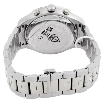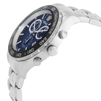 Silver-tone stainless steel case and bracelet. Black stainless steel bezel. Blue dial with silver-tone hands and index hour markers. Minute markers around the outer rim. Tachymeter on outer rim. Dial Type: Analog. Luminescent hands and markers. Date display at the 4 o'clock position. Chronograph - three sub-dials displaying: 60 second, 30 minute and 1/10th of a second. Quartz movement. Scratch resistant sapphire crystal. Pull / push crown. Solid case back. Round case shape, case size: 43 x 56.6 mm. Water resistant at 50 meters / 165 feet. Functions: chronograph, date, hour, minute, second. Hellenyium Series. Dress watch style. Watch label: Swiss Made. Versace Hellenyium Chronograph Quartz Blue Dial Men's Watch VEPCA0324.