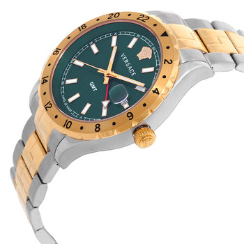 Silver-tone stainless steel case with a two-tone (silver-tone and rose gold-tone) stainless steel bracelet. Fixed rose gold-tone stainless steel bezel. Green dial with rose gold-tone hands and index hour markers. Minute markers around the outer rim. Dial Type: Analog. Luminescent hands and markers. Date display at the 3 o'clock position. Quartz movement. Scratch resistant sapphire crystal. Pull / push crown. Solid case back. Round case shape, case size: 42 mm. Deployment clasp. Water resistant at 50 meters / 165 feet. Functions: GMT, second time zone, date, hour, minute, second. Hellenyium Series. Sport watch style. Watch label: Swiss Made. Versace Hellenyium GMT Quartz Green Dial Men's Watch V11050016.