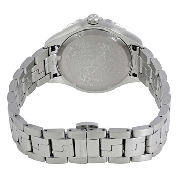 Stainless steel case with a stainless steel bracelet. Fixed grecca embossed stainless steel bezel. Pink dial with luminous silver-tone hands and index hour markers. The Medusa Head logo appears at the 12 o'clock position. Minute markers around the outer rim. Dial Type: Analog. Luminescent hands and markers. Date display at the 3 o'clock position. Quartz movement. Scratch resistant sapphire crystal. Solid case back. Case size: 35 mm. Case thickness: 10 mm. Round case shape. Band width: 16 mm. Deployment clasp with a push button release. Water resistant at 50 meters / 165 feet. Functions: date, hour, minute, second. Dress watch style. Watch label: Swiss Made. Versace Hellenyium Pink Dial Stainless Steel Ladies Watch V12010015.