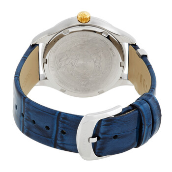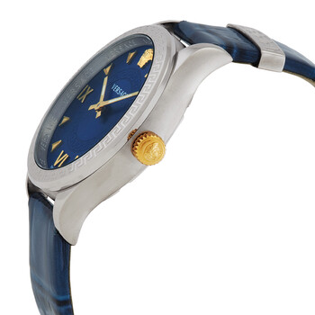 Silver-tone stainless steel case with a blue leather strap. Fixed silver-tone stainless steel bezel. Blue dial with gold-tone hands and index-Roman numeral hour markers. Medusa head marks the 12 o'clock position. Dial Type: Analog. Luminescent hands. Quartz movement. Scratch resistant sapphire crystal. Pull / push crown. Solid case back. Round case shape, case size: 35 mm, case thickness: 9 mm. Band width: 17 mm. Buckle clasp. Water resistant at 50 meters / 165 feet. Functions: hour, minute. Hellenyium Series. Casual watch style. Watch label: Swiss Made. Versace Hellenyium Quartz Blue Dial Ladies Watch VE2S00122.