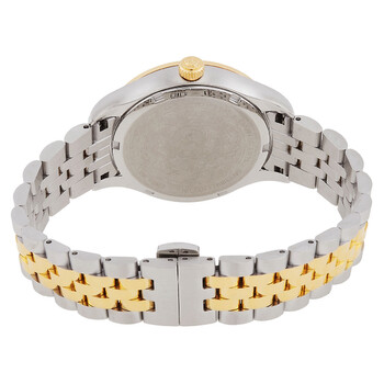 Silver-tone stainless steel case with a two-tone (silver-tone and gold-tone) stainless steel bracelet. Fixed gold-tone stainless steel bezel. Blue dial with gold-tone hands and index-Roman numeral hour markers. Medusa head marks the 12 o'clock position. Dial Type: Analog. Quartz movement. Scratch resistant sapphire crystal. Pull / push crown. Solid case back. Round case shape, case size: 35 mm. Deployment with push button release clasp. Water resistant at 50 meters / 165 feet. Functions: hour, minute. Hellenyium Series. Dress watch style. Watch label: Swiss Made. Versace Hellenyium Quartz Blue Dial Two-Tone Ladies Watch VE2S00522.
