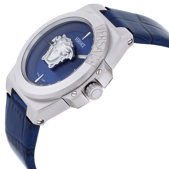 Silver-tone stainless steel case with a blue leather strap. Fixed silver-tone stainless steel bezel. Blue dial with silver-tone hands and index hour markers. Dial Type: Analog. Ronda Caliber 751 quartz movement. Scratch resistant sapphire crystal. Pull / push crown. Solid case back. Round case shape, case size: 37 mm, case thickness: 12.4 mm. Deployment with push button release clasp. Water resistant at 50 meters / 165 feet. Functions: hour, minute. Hera Series. Dress watch style. Watch label: Swiss Made. Versace Hera Quartz Blue Dial Ladies Watch VE8D00124.
