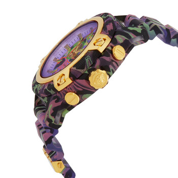 Lilac leopard polycarbonate case with a lilac leopard silicone strap. Fixed lilac leopard polycarbonate bezel. Lilac leopard dial with gold-tone hands and index hour markers. Minute markers around the outer rim. Medusa head marks the 12 o'clock position. Dial Type: Analog. Luminescent hands and markers. Date display at the 6 o'clock position. Chronograph - two sub-dials displaying: 60 second and 30 minute. Quartz movement. Scratch resistant sapphire crystal. Pull / push crown. Solid case back. Round case shape, case size: 44 mm. Tang clasp. Water resistant at 30 meters / 100 feet. Functions: chronograph, date, hour, minute, second. Icon Active Series. Sport watch style. Watch label: Swiss Made. Versace Icon Active Chronograph Quartz Lilac Leopard Men's Watch VEZ700722.