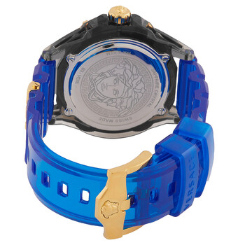 Transparent synthetic case with a blue silicone strap. Fixed black bezel. Blue dial with gold-tone hands and index hour markers. Dial Type: Analog. Luminescent hands and markers. Quartz movement. Scratch resistant sapphire crystal. Solid case back. Round case shape, case size: 42 mm, case thickness: 13 mm. Band width: 22 mm. Buckle clasp. Water resistant at 30 meters / 100 feet. Functions: hour, minute, second. Icon Series. Sport watch style. Watch label: Swiss Made. Versace Icon Quartz Blue Dial Men's Watch VE6E00323.