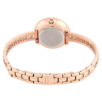 Rose gold-tone stainless steel case and bracelet. Fixed rose gold-tone stainless steel bezel. Rose gold-tone dial with rose gold-tone hands and dots hour markers. Dial Type: Analog. Quartz movement. Scratch resistant sapphire crystal. Pull / push crown. Solid case back. Round case shape, case size: 28 mm. Jewelry clasp. Water resistant at 30 meters / 100 feet. Functions: hour, minute. La Greca Series. Dress watch style. Watch label: Swiss Made. Versace La Greca Quartz Rose Gold Dial Ladies Watch VE8C00424.