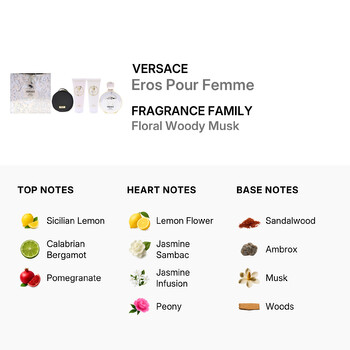 Eros Pour Femme opens with a bright burst of Sicilian lemon, Calabrian bergamot, and juicy pomegranate. These vibrant top notes create a fresh and energizing start that awakens the senses. As the fragrance blossoms, a heart of lemon flower, jasmine sambac, jasmine infusion, and peony adds a soft, floral elegance. The base settles into a warm and sensual blend of sandalwood, ambrox, musk, and woods, leaving a lasting trail of allure and confidence.