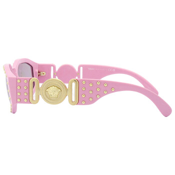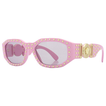 Versace Sunglasses. Series number: VE4361. Color code: 539687. Shape: Geometric. Lens Width: 53 mm. Lens Bridge: 18 mm. Arm Length: 140 mm. 100% UV protection. Frame Material: Nylon. Frame Color: Pink. Lenses Type: Light Grey. Rim Style: Full-Rim. UPC/EAN code: 8056597809771. Versace Light Grey Geometric Unisex Sunglasses VE4361 539687 53.