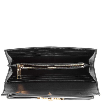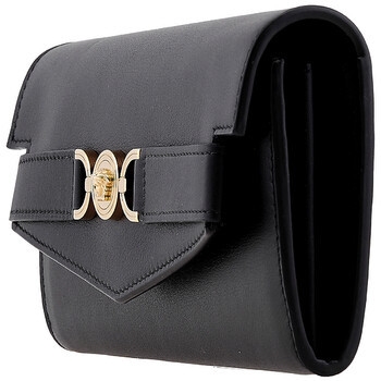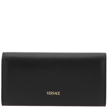 Versace Ladies Wallets. SKU: 1014690-1A10795-BLACK-VERSACE GOLD. Color: Black/Versace Gold. Size: L 6.9" x W 1.4" x H 3.7". Versace Medusa 95 Leather Wallet. This leather continental wallet features Medusa '95 hardware, a snap-button closure, three internal compartments, 12 card slots, and an internal zipped pocket. 100% Calf leather. Made in Italy.